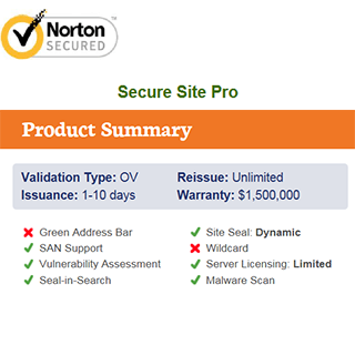 Symantec™ is the premier name in the SSL industry, and the Secure Site Pro proves why. This comprehensive and trusted SSL certificate goes above and beyond standard encryption. The Symantec name, along with the Norton checkmark, are two of the most trusted images on the web, so your customers will instantly be assured that you’re a reputable business and safe to make transactions with. Additionally, this certificate includes daily malware scanning, along with a vulnerability assessment. You simply won’t find a more feature-rich Organization Validated (OV) certificate, making this a perfect solution for larger companies and any business looking to throw its name in with the leaders in their industry.