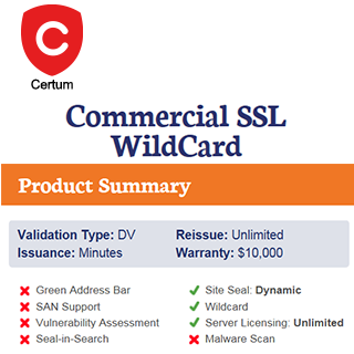 The Certum Commercial SSL Wildcard certificate is a fast and effective way to secure your main domain and all of the accompanying subdomains. That’s right, with just a single SSL certificate, you can secure www.domain.com along with xyz.domain.com, hello.domain.com, etc. And, because this is a domain validated (DV) certificate, it can usually be issued in just a matter of minutes. So, you can boost the trust in your site with https, the padlock icon, and the Secured by Certum Site Seal quickly. This wildcard certificate is ideal for startup websites and light ecommerce sites.