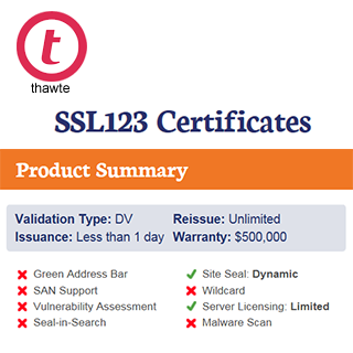 Thawte™ is one of the most respected names in the SSL industry. This low-cost certificate offers the industry standard 128/256-bit encryption and is one of the most popular Domain Validated (DV) SSL certificates on the planet. What makes it so popular is its combination of trust, security, and speed – as this certificate and it’s widely recognized brand can be issued to a domain in less than one business day. The Thawte SSL123 name says it all, getting a quality security certificate on your small business website or light ecommerce site is as easy as 1... 2… 3!