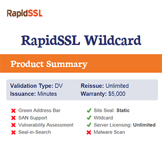 RapidSSL® is a leading provider of fast and easy SSL certificates. This low-cost certificate offers standard 128/256-bit encryption and is one of the most popular Domain Validated (DV) wildcard SSL certificates in the world. It’s known for lightning fast issuance and an unbeatable price. Also, 99+% of all browsers recognize this certificate. The RapidSSL wildcard certificate is an ideal solution for entry-level websites that need to protect one main domain (both www and non-www) along with their subdomains (i.e. theSSLstore.com, mail.theSSLstore.com, admin.theSSLstore.com, retail.theSSLstore.com, etc.)