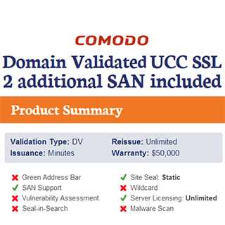 The Comodo Domain Validated (DV) UCC is one of the quickest ways to secure multiple domains with just a single SSL certificate. As a Unified Communications certificate, this product has been designed exclusively for Microsoft Exchange 2010 as well as Office Communications Server 2007. Additionally, because this is a domain validated (DV) certificate, it can be issued to a domain in just a matter of minutes. There is simply no quicker option for when you want to secure your Microsoft Exchange or Office Communications servers.